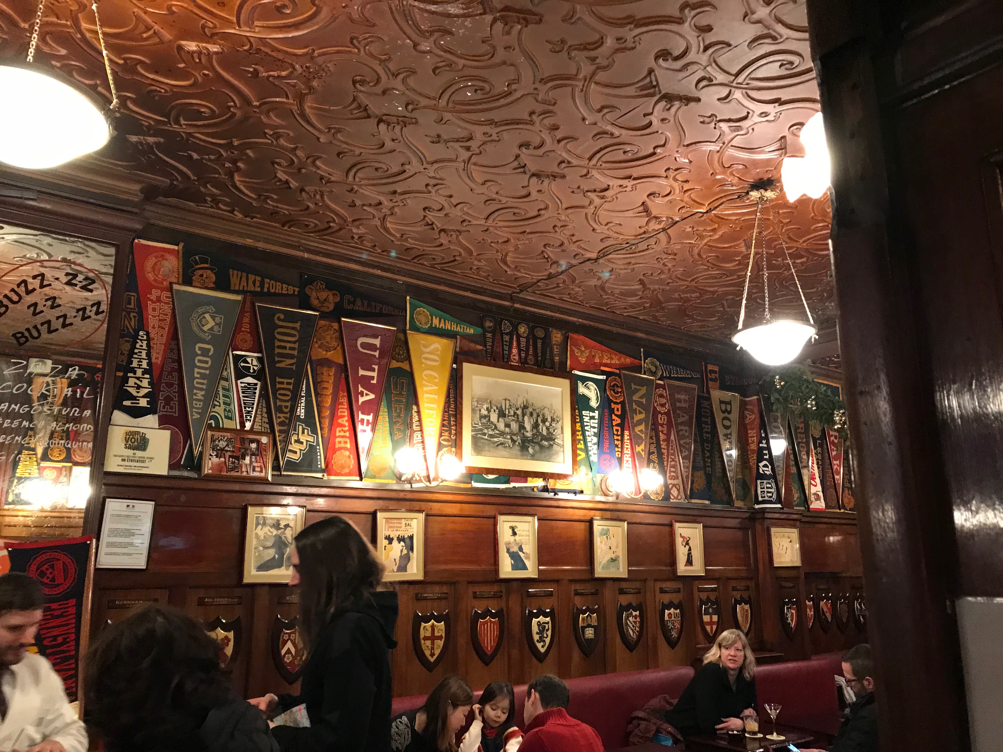 We wandered in, tired, footsore, and ready for a drink, and were instantly at home. The bar menu is significant, with an excellent whisky and scotch selection, pages of jazz age cocktails, and quirky illustrations. The walls and bar are heavy carved oak, so the bar is elegant and quiet, without being stuffy, and college pennants are everywhere! The Daughter was disappointed that her college was not represented, so we will remedy that on the next trip! The biggest surprise was their very short menu, which consists solely of a hot dog offering, other than the standard bar snacks of mixed nuts, served with our drinks. It has never been my opinion that hotdogs are actually food, but I was hungry, and snagged a bite or two of Annabel’s. It was surprisingly good, and they are steamed in a vintage style steamer that sits on the counter.